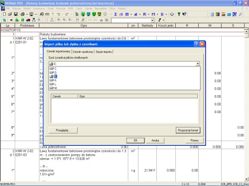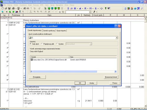 Aby zaimportować ceny jednostkowe robót, postępujemy podobnie, jak w przypadku cen materiałów i sprzętu – wybieramy z menu programu Ceny -> Importuj cennik, wskazujemy „Cały dysk” oraz naciskamy klawisz „Rozpoznaj format”.