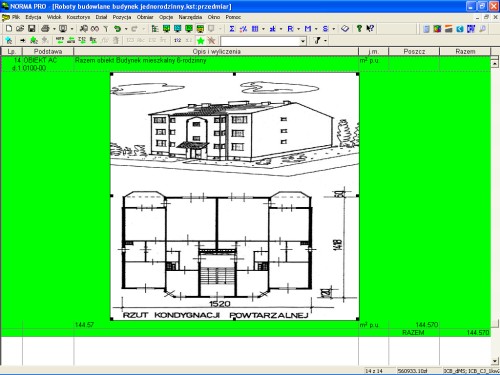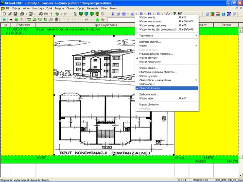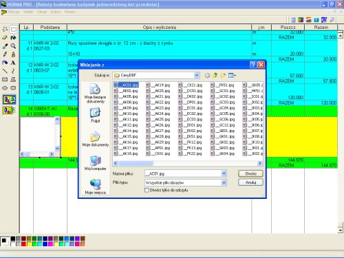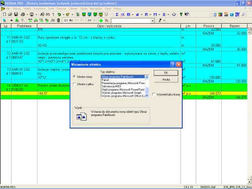 Do każdego obiektu oprócz opisu dołączono również jego postać graficzną, która póki co nie jest importowana bezpośrednio do programu Norma (może kiedyś). Możemy jednak taką grafikę dołączyć do pozycji kosztorysowej. W tym celu z menu „Obmiar” wybieramy „Wstaw obiekt”, a następnie szukamy „Obraz programu Paintbrush” i naciskamy „OK”.