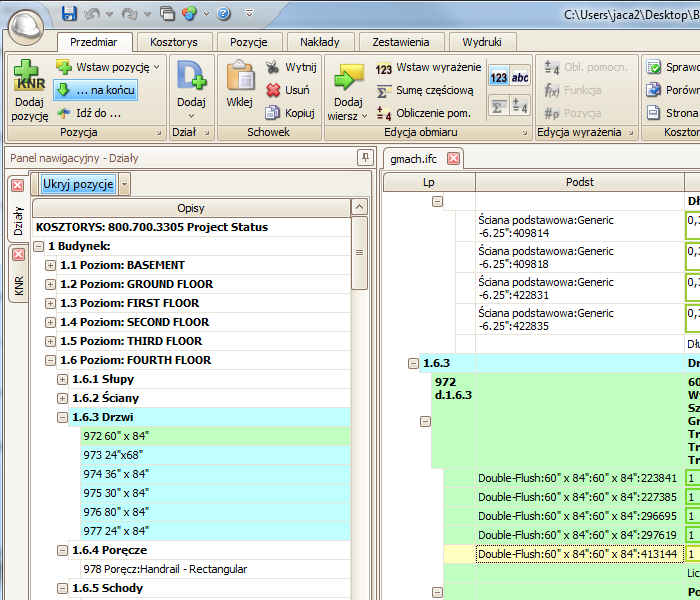 Plik w formacie IFC zostanie automatycznie przekonwertowany do formatu kosztorysu programu Norma EXPERT, który będzie miał strukturę w pełni zgodną ze standardami technologii BIM; otrzyma nazwę obiektu projektu BIM, oraz podział struktury działów zgodnie ze standardem: podziałem na budowy, budynki, kondygnacje, elementy rodzin, oraz listę poszczególnych elementów obiektu budowlanego jako pozycje kosztorysowe wraz z ich przedmiarem.