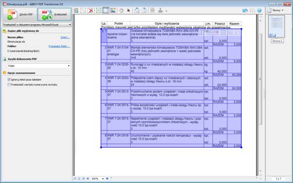 Po uruchomieniu aplikacji Abbyy Transformer należy otworzyć interesujący nas dokument PDF (ja poddam obróbce plik z zeskanowanym przedmiarem z kosztorysu przykładowego „Klimatyzacja.kst”).