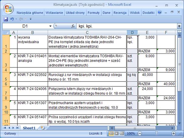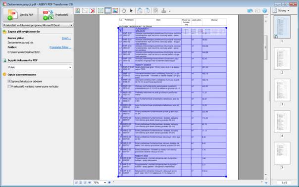 Używając tej samej metody przekształcić można również inne skany dokumentów, np. zestawienie pozycji. Ten układ jest nieco łatwiejszy do konwersji, ponieważ jeden wiersz tabeli zawiera dokładnie jedną pozycję przedmiaru.