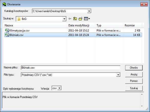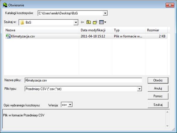 Przechodzimy do programu Norma i wybieramy opcję „Otwórz” z menu „Plik”. W oknie „Otwieranie”, w polu „Pliki typu” ustawiamy format „Przedmiary CSV”.