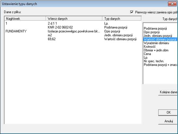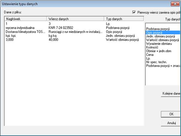 Następnie wskazujemy nasz plik, który utworzyliśmy za pomocą Abbyy Transformer i MS Excel. Pojawi się okno „Ustawienie typu danych”, w którym należy powiązać dane z pliku z kolumnami w Normie. Przyporządkowanie kolumn wykonuje się na jednej pozycji, którą można wyświetlić po wciśnięciu klawisza „Kolejne dane” (zazwyczaj pierwszy wiersz w pliku to dział na podstawie, którego nie można tego wykonać).