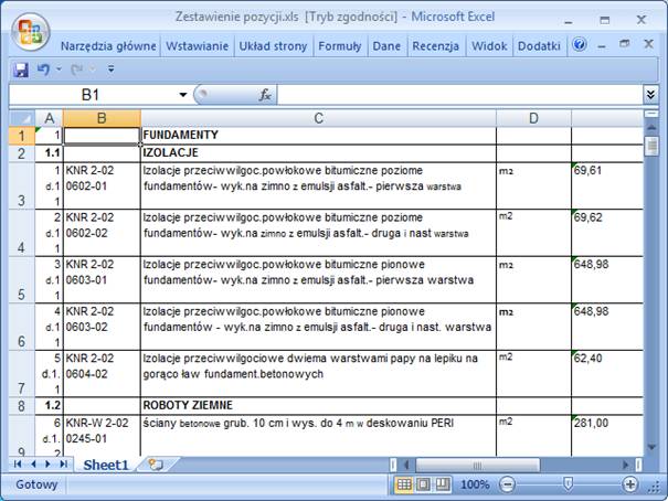 W przypadku zestawienia pozycji mogą się pojawić kolumny „Cena jednostkowa” i „Wartość”, których nie można wczytać, dlatego w Excelu najlepiej je usunąć i pozostawić tylko kolumny występujące w przedmiarze/obmiarze.
