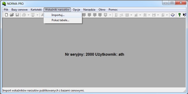 Płytę z cennikami umieszczamy w napędzie CD/DVD. Po uruchomieniu Normy (jeszcze przed otworzeniem kosztorysu) wybieramy z górnego menu polecenie: "Wskaźniki narzutów -> Importuj..." (przy okazji, widoczna poniżej opcja "Pokaż tabele" wyświetla tabelę zaimportowanych wskaźników narzutów).