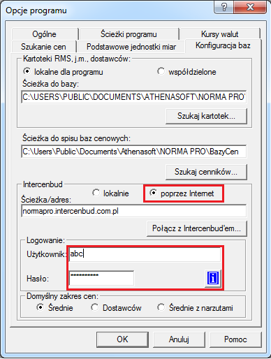 Proszę pamiętać, że ta metoda jest dostępna tylko dla abonentów Intercenbudu, po wcześniejszym skonfigurowaniu dostępu w "Opcjach programu". Na zakładce "Konfiguracja baz" należy zaznaczyć opcję "poprzez internet" i uzupełnić pola: "Użytkownik" i "Hasło" w sekcji "Logowanie" (klient otrzymuje te dane po wykupieniu abonamentu).