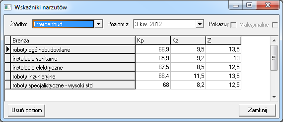 W oknie "Wskaźniki narzutów" można wybrać wydawcę (Intercenbud, Promocja), poziom, branżę i poszczególne wskaźniki.