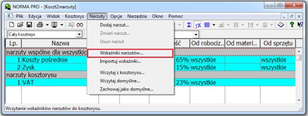A oto, jak wykorzystać zaimportowane wskaźniki w kosztorysie. Po otwarciu kosztorysu przełączamy się na widok "Narzuty kosztorysu" (klawisz F12). Z górnego menu wybieramy polecenie "Narzuty -> Wskaźniki narzutów...".