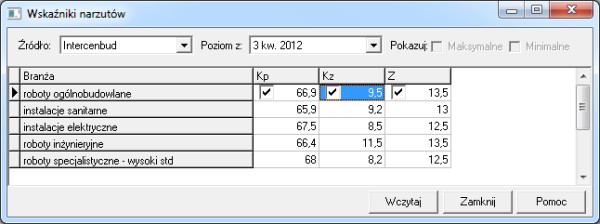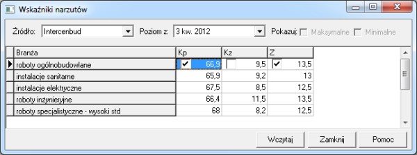 W oknie "Wczytaj wskaźniki narzutów z cenników" można wybrać wydawcę (Intercenbud, Promocja), poziom, branżę i poszczególne wskaźniki.