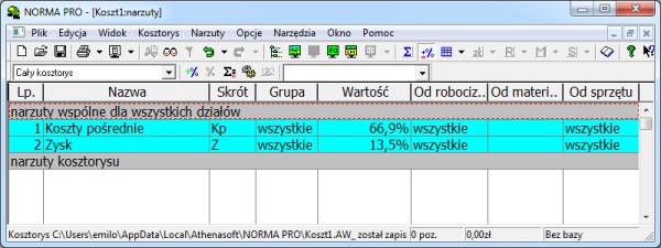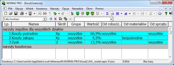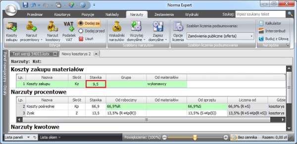 Korzystając ze skrótów przypisanych narzutom, program zmienia ich stawki (nie dodaje nowych narzutów).