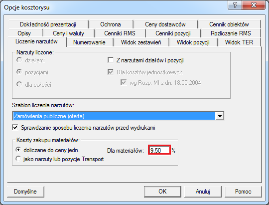 Przy doliczaniu kosztów zakupu do cen jednostkowych materiałów w kosztorysie, wskaźnik zostanie wczytany na zakładkę "Liczenie narzutów" w oknie "Opcje kosztorysu".