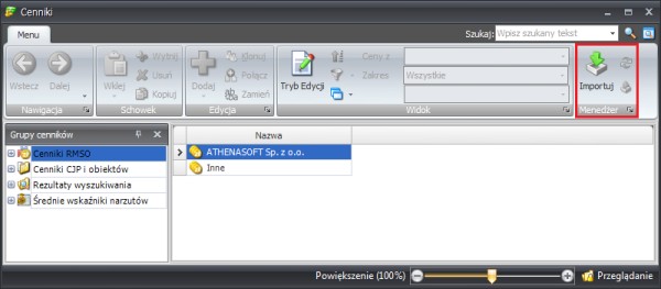 W oknie „Cenniki” które się wyświetli wybieramy polecenie „Importuj" na wstążce poleceń.