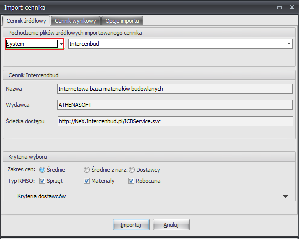Najłatwiej jest oczywiście zaimportować narzuty on-line. W oknie importu wystarczy wybrać opcję "System -> Intercenbud" i kliknąć na przycisku z napisem "Importuj". Tak jak wcześniej wskaźniki zostaną zaimportowane w tle.