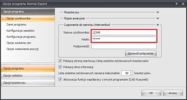 Proszę pamiętać, że ta metoda jest dostępna tylko dla abonentów serwisu Intercenbud, po wcześniejszym skonfigurowaniu dostępu. Na zakładce "Opcje użytkownika" w "Opcjach programu" należy uzupełnić pola: "Nazwa użytkownika" i "Hasło" w sekcji "Logowanie do serwisu Intercenbud" (klient otrzymuje te dane po wykupieniu abonamentu).