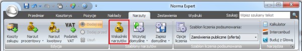 A oto jak wykorzystać zaimportowane wskaźniki w kosztorysie. Po otwarciu kosztorysu przełączamy się na widok "Narzuty kosztorysu" (klawisz F12). Z wstążki poleceń wybieramy nowe polecenie "Wskaźniki narzutów".