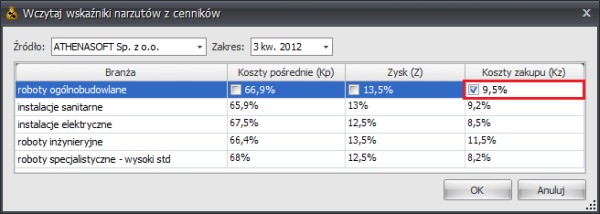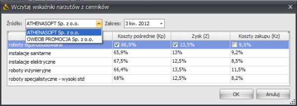 Przycisk "OK" przeniesie zaznaczone wartości do kosztorysu.