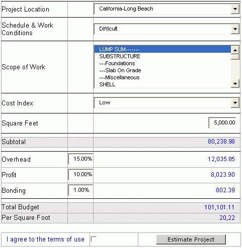 Use our online construction cost software to estimate square foot building costs in over 160 U.S. Cities. Nothing to download or update. Simply select the building cost model, location, schedule, scope of work, cost index, building size and adjust overhead, profit and bonding.