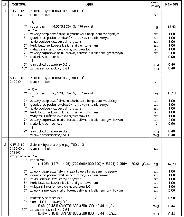 W poniższym przykładzie wyliczam przez interpolację normy na montaż zbiornika o pojemności 700 dm3 w przedziale pomiędzy wiodącymi parametrami, którymi była pojemność zbiorników 800 dm3 i 600 dm3 - na podstawie KNR nr 2-15 tabl.0122 kol.04 i kol.03. Poszukiwane wartości są wyższe o 50 % różnicy normatywów dla zbiorników o pojemności 800 i 600 dm3 od wartości normatywu z kol.03.