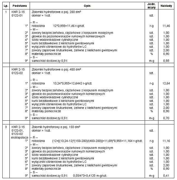 W poniższym przykładzie poszukiwałem przez ekstrapolację norm na montaż zbiornika o pojemności 150 dm3, (poniżej wiodącego parametru którym była pojemność zbiornika 200 dm3 zawarta w KNR nr 2-15 tabl.0122 kol.01). Poszukiwana wartość znajdowała się o poniżej wartości określonej w KNR nr 2-15 tabl.0122 kol.01, o 25% różnicy normatywów dla zbiorników o pojemności 400 i 200 dm3 (KNR nr 2-15 tabl.0122 kol.02 i kol.01).