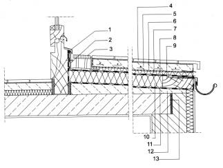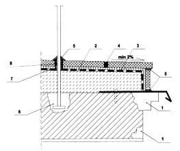 | Przykład prawidłowego rozwiązania konstrukcyjnego uszczelnienia tarasu - wariant z uszczelnieniem podpłytkowym (tzw. zespolonym lub alternatywnym)