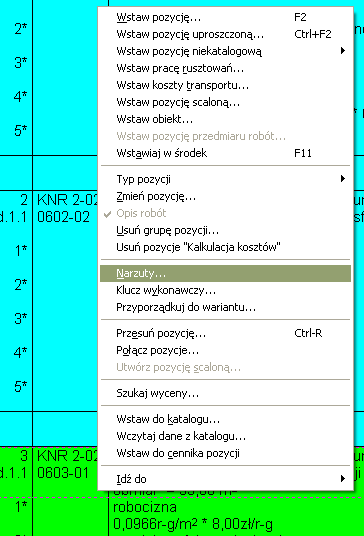 Gdy chcemy dla pozycji zdefiniować narzuty inne niż określone dla kosztorysu lub działu, możemy z menu Pozycja lub z menu podręcznego, w momencie gdy wskazana została na formularzu kosztorysu interesująca nas pozycja, wybrać hasło Narzuty. Program przejdzie wówczas do edytora narzutów.