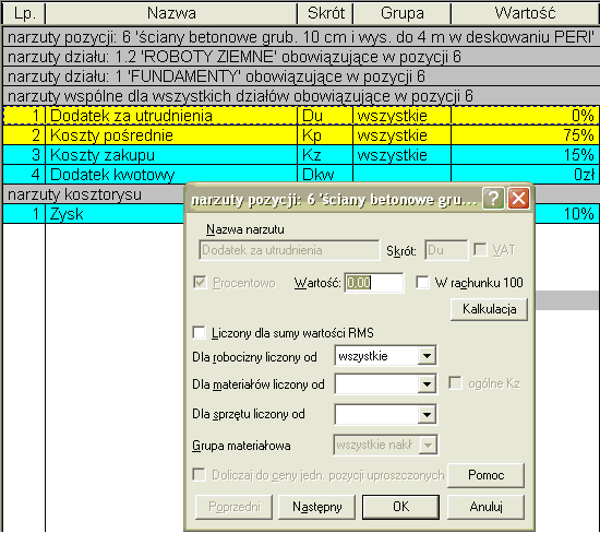 Dopóki nie zostaną dla danej pozycji zdefiniowane jej narzuty indywidualne, każdej z nich dotyczą narzuty działu, w którym się znajduje. Aby edytować wartość istniejących narzutów, musimy wskazać wiersz z jego definicją i dwukrotnie kliknąć lub nacisnąć ENTER. Pokaże się wówczas okno narzutu, w którym możemy poustawiać wszystkie dane. Na Rys. 2. widać, że wśród narzutów wspólnych działu obowiązujących dla pozycji 6 dwa są podświetlone na żółto, a trzy na niebiesko. Oznacza to, że dwa pierwsze mają wartości inne niż w pozostałych pozycjach działu, a trzy takie same.