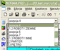Czytelniczka w liście do redakcji zadała pytanie, w jaki sposób ma się zorientować, w których pozycjach zostały zdeklarowane indywidualne narzuty. Otóż jest to bardzo proste. Gdy wejdziemy w widok edytora narzutów, zobaczymy w lewym, górnym rogu ekranu rozwijalną listę elementów kosztorysu, dla których określono narzuty. Wśród nich znajdziemy wszystkie te pozycje, których narzuty różnią się od innych.