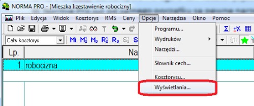 Zobaczmy, jak to wygląda w praktyce. Na początek zajmijmy się omówieniem zmiany wielkości i rodzaju czcionki dla całego kosztorysu, czyli tym, co w programie było „od zawsze”. Z górnego menu wybierzmy polecenie Opcje -> Wyświetlania.