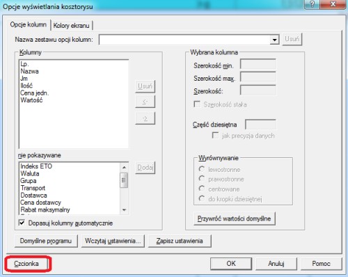 W oknie Opcje wyświetlania kosztorysu, w lewym dolnym rogu znajduje się przycisk Czcionka, za pomocą którego możemy dokonać wspomnianych wcześniej zmian.