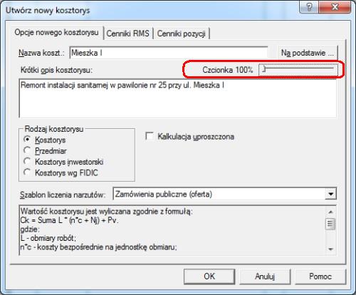 Kolejnym krokiem do zwiększenia czytelności kosztorysu, wpływającym na poprawę jakości pracy, jest możliwość skalowania wyświetlanej czcionki w niektórych „okienkach” programu. Zaczynając pracę nad kosztorysem, pierwszym miejscem, gdzie można tego dokonać, jest pole „Krótki opis kosztorysu”. Tu, pod przyciskiem „Na podstawie”, jest suwak, za pomocą którego można zmieniać wielkość czcionki. Poniżej widać tekst przed zmianą wielkości.
