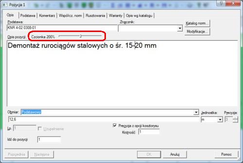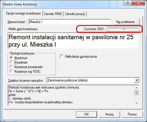 W Normie PRO od początku istnieją narzędzia do poprawy czytelności kosztorysu, ale od pewnego czasu mamy dodatkowo możliwość zmiany wielkości niektórych okien dialogowych oraz czcionek (w zakresie od 100% do 300%) w wielowierszowych polach edycyjnych w ważniejszych oknach: