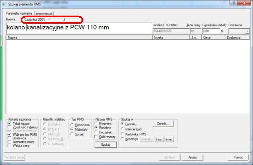 W oknie wyszukiwania cen nakładów RMS także jest możliwość skalowania wielkości czcionki.