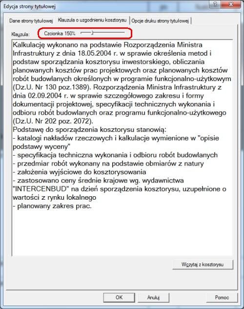 Podczas edycji strony tytułowej, na zakładce „Klauzula o uzgodnieniu kosztorysu” również spotkamy się z podobną opcją zmiany czcionki.
