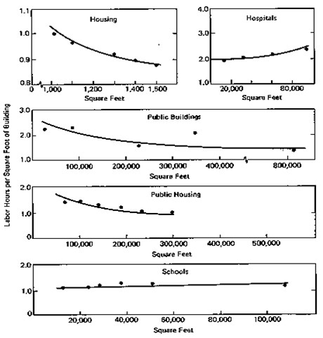 Badania zależności funkcjonalnej pomiędzy wielkością budowanego obiektu wyrażoną w jednostkach rzeczowych a, przykładowo, ilością godzin pracy - dla domu mieszkalnego, szpitala, budynku publicznego, budynku komunalnego oraz szkoły - przedstawiają poniższe wykresy zależności funkcjonalnych.