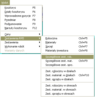 i kliknąć na haśle Szczegółowe zestawienie robocizny lub z menu Widok wybrać hasło Zestawienia RMS i następnie hasło Szczegółowe zest.rob.