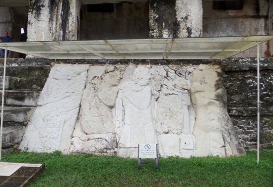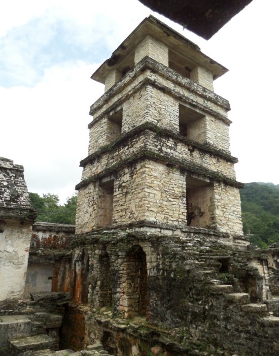 Kolejne imponujące ruiny wznoszące się w pobliżu Świątyni Inskrypcji to tzw. Pałac, czyli ustawiony na wysokiej kamiennej platformie duży budynek z dziedzińcami, zadaszonymi przejściami i tunelami (fot. 5), a także częściowo zrekonstruowaną czterokondygnacyjną wieżą (fot. 6), służącą do prowadzenia zaawansowanych obserwacji astronomicznych. Ściany pałacu pokryte były kamiennymi reliefami; na murkach otaczających dziedzińce umieszczono liczne rzeźby i hieroglify, z których część zachowała się do naszych czasów (najcenniejsze z nich nawet zabezpieczono daszkami z lexanu, fot. 7), ale w obecnej postaci, po całkowitym wyblaknięciu kolorów roślinnych farb, jakimi były kiedyś pokryte, nie dają pełnego wyobrażenia o pierwotnej świetności.