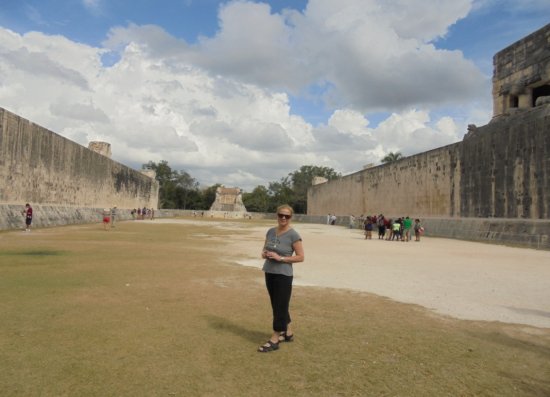 No i oczywiście boisko do gry w piłkę, jak na fot. 10. Grę nieco inną niż dziś (jej oryginalna majańska nazwa brzmiała pitz, zaś Aztekowie nazywali ją ullamaliztli, co łatwo zapamiętać), bo nie było bramek, a kauczukową piłkę, podbijaną biodrem lub udem trzeba było przerzucić przez niewielki otwór w kamiennym pierścieniu zawieszonym na ścianie bocznej muru otaczającego boisko, na wysokości 4 - 5 m (jak się dobrze przypatrzeć, jest on widoczny na fot. 10, po prawej stronie, tak trochę na lewo od palmy). Grano do tzw. pierwszego trafienia, jednak ze względu na skalę trudności zadania mecz mógł trwać wiele godzin.