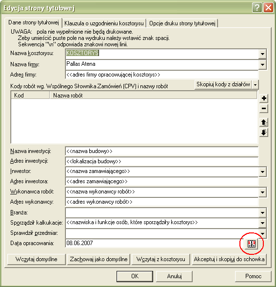 Kolejnym drobnym udogodnieniem dla użytkowników programów Norma jest dołączenie do strony tytułowej kosztorysu przycisku pozwalającego wywoływać kalendarz, z którego wskazana data zostanie automatycznie wstawiona do kosztorysu. Po wywołaniu okna edycji danych strony tytułowej (menu Opcje / Kosztorysu, przycisk Strona tytułowa) możemy użyć przycisku oznaczonego na Rys.1. czerwonym kółkiem.