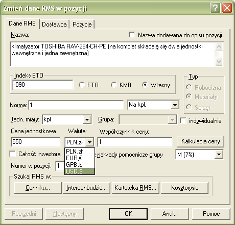 W sytuacji, gdy do kosztorysu wstawiamy materiał kupiony za walutę inną niż złotówki, wpisujemy kwotę np. w dolarach, a program ją przelicza i wyświetla odpowiednią kwotę w złotówkach.