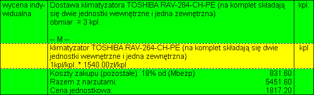 W przykładzie na Rys. 2. wpisano cenę klimatyzatora i wybrano walutę USD,$. Program na podstawie tabeli kursów walut wyliczył i wyświetlił cenę w złotych.