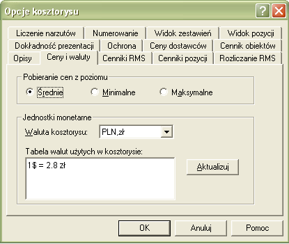 Jednocześnie w opcjach kosztorysu tabela walut została uzupełniona o kurs dolara.