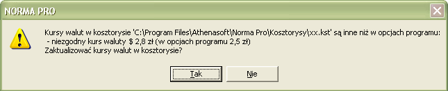 Jeżeli kosztorys z taką pozycją zapiszemy na dysku, to gdy przed ponownym wczytaniem go, tabela kursów w programie zostanie zmodyfikowana, program poinformuje o tym i zapyta o decyzję. Możemy w kosztorysie pozostawić kurs z momentu utworzenia, albo zmienić na aktualny.