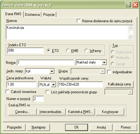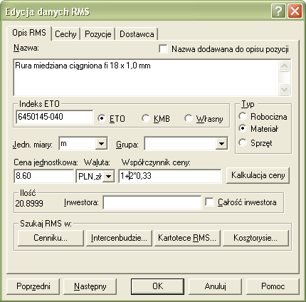 Po wybraniu danych i zatwierdzeniu przyciskiem OK wyliczona cena zostanie wstawiona do danych elementu RMS.