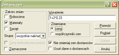 Jeżeli chcemy zmienić jednocześnie ceny wielu elementów RMS w kosztorysie za pomocą współczynnika (który może być przedstawiony w postaci wyrażenia), wykorzystujemy hasło Zmień ceny w menu Ceny.