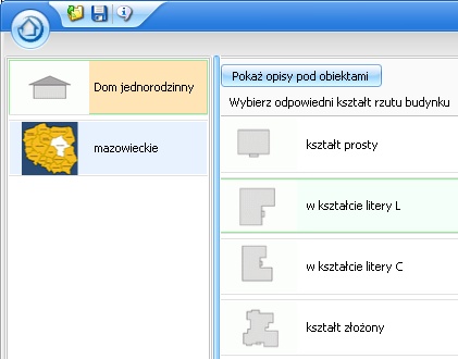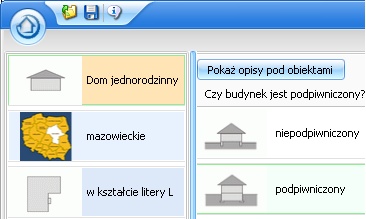 Następnie w prosty sposób wybieramy warianty wykonania. W naszym przykładzie, gdzie obiektem jest dom jednorodzinny, możemy określić kształt rzutu budynku (Rys.3.), to - czy jest podpiwniczony (Rys.4.), ile ma kondygnacji, czy rodzaj dachu.