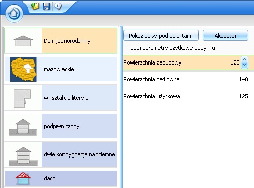 Następnym krokiem, który musi wykonać użytkownik programu, jest określenie parametrów użytkowych obiektu. W przypadku naszego budynku będą to: powierzchnia użytkowa, powierzchnia zabudowy i powierzchnia całkowita.