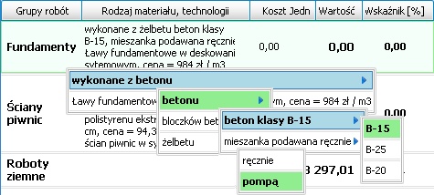 Wartości, które pojawiły się w tym momencie na ekranie, zostały wyliczone przy założeniu, że zastosowano typowe technologie i wykorzystano typowe materiały. Użytkownik ma jednak możliwość wprowadzić dane inne niż te, które przyjęli autorzy programu. Na Rys.7. widać, że użytkownik określa samodzielnie rodzaj fundamentów, wybierając z systemu rozwijalnych menu kolejne możliwości. Może np. określić czy fundamenty są zbrojone, wybrać rodzaj zbrojenia, określić markę betonu oraz sposób jego rozkładania.