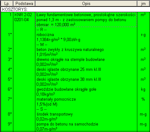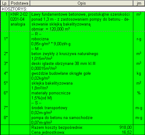 Jak widać z wykazu materiałów, dla tej pozycji przewidziano wykonanie szalunku z desek, czego dziś praktycznie się nie stosuje. Najczęściej używa się deskowań systemowych, te jednak zostały uwzględnione w tablicach 0251 – 0263 Katalogu, więc nie będę opracowywał dla nich normatywów. Nie znalazłem natomiast w Katalogu pozycji na roboty betonowe, które uwzględniałyby deskowanie z wykorzystaniem sklejki bakelityzowanej. Jeżeli muszę skosztorysować taką robotę, to wczytuję pozycję 0201-04 i odpowiednio ją modyfikuję. Zmniejszam nakłady robocizny, usuwam większość desek i drewno na stemple (zastosuję stemple rozporowe wielokrotnego użytku). W rezultacie uzyskuję pozycję jak na Rys. 2.