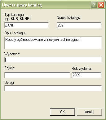 Wszystko w porządku jeżeli taką pozycję zamieszczam w jednym kosztorysie. Gdy jednak przewiduję, że będę chciał ją wykorzystać później, powinienem umieścić ją w katalogu własnym. W tym celu muszę utworzyć nowy katalog (chyba, że uczyniłem to już wcześniej).