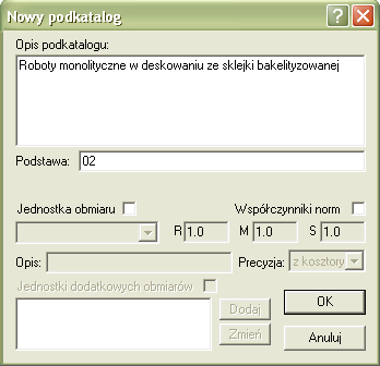 Wpisujemy tytuł rozdziału i jego numer, który będzie częścią podstawy wyceny pozycji (tych które do niego wstawimy). Możemy też określić dodatkowe dane dotyczące elementów niższego poziomu (tablic i pozycji), o ile nie określimy im danych indywidualnych. Do zdefiniowanego podkatalogu możemy już bezpośrednio wstawiać pozycje. Możemy też wprowadzić kolejny poziom podkatalogu, tworząc strukturę drzewiastą. Poziomów podkatalogów może być do dziesięciu. Ja wstawię jeden kolejny poziom, który będzie pełnił rolę tablicy Ławy fundamentowe betonowe, prostokątne - z zastosowaniem pompy do betonu - deskowanie sklejką bakelityzowaną.